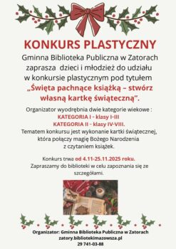 „Święta pachnące książką – stwórz własną kartkę świąteczną” – konkurs plastyczny. Opublikowano 04 listopada, 2025 by biblioteka InAktualności, Blog, News